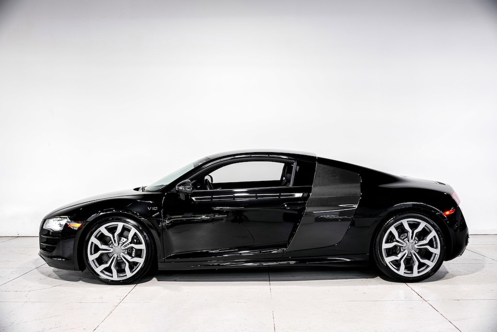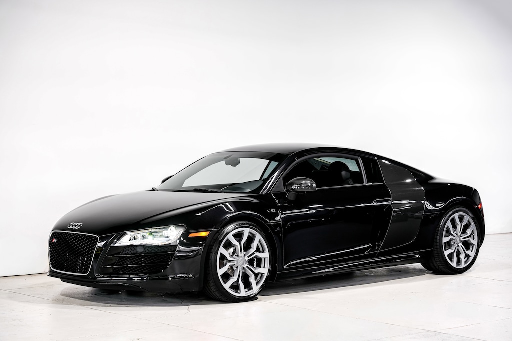 Powered by a 5.2-liter FSI V10 sending power to all four wheels through a six-speed manual transaxle, this Audi R8 is finished in Phantom Black Pearl over black leather upholstery. Equipment includes carbon-fiber Sigma side blades and mirror caps, 19'' Y-design wheels, a speed-activated rear spoiler, LED lighting, the Audi Parking System Plus with a rearview camera, carbon-fiber interior trim, a Bang & Olufsen sound system, an Audi Concert CD stereo, navigation, heated power-adjustable seats, and automatic climate control.